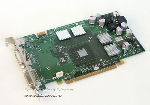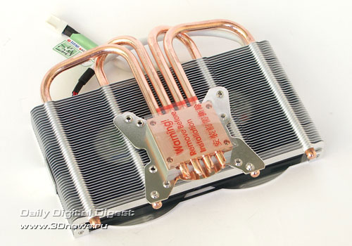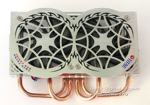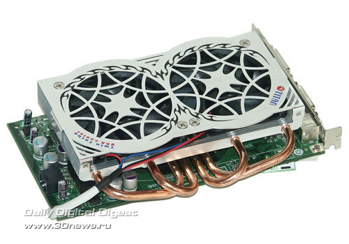 Комплектация минимальна, но все необходимое есть в достатке: сам кулер, набор крепежа, радиаторы на память и шприц с термопастой. Скорость вентиляторов фиксирована на значении 2000 об/мин, поэтому регулятор скорости не нужен.Четыре тепловые трубки выглядят очень серьезно, а вкупе с двумя вентиляторами сулят и хорошую производительность. Вентиляторы накрывают собой почти всю поверхность радиатора, что обеспечивает хороший обдув всей площади рассеивания тепла. Немного смущает лишь небольшая площадь рассеивания самого радиатора, но тому есть серьезные причины. Толщина радиатора невысока, чуть больше диаметра теплотрубок, но важной задачей такого рода кулеров является необходимость вписаться в два слота вместе с видеокартой, поэтому вместить радиатор с большей площадью рассеивания не удалось. Основание состоит из двух половинок: медной, которая контактирует с графическим процессором, и алюминиевой, несущей крепежную крестовину. В вырезанных желобках зажаты четыре тепловые трубки. Следов пайки увидеть не удалось - вероятно, используется какой-то термоинтерфейс. Помимо кулера для графического процессора, в составе Titan Twin Turbo идут восемь радиаторов для микросхем памяти. Как вы можете заметить, два из восьми радиаторов имеют меньшую высоту и предназначены для установки на те микросхемы памяти, над которыми будут проходить тепловые трубки кулера. Тут, к сожалению, инженеры компании Titan немного просчитались: при установке кулера на подопытную видеокарту Leadtek GeForce 8600GTS, тепловые трубки кулера оказались немного ниже уровня уменьшенных радиаторов, и от них пришлось отказаться.Итоговая конструкция получилась достаточно громоздкой. По высоте она полностью занимает два свободных слота, но для нормальной работы кулера придется отказаться и от третьего, иначе вентиляторам неоткуда будет затягивать воздух.
