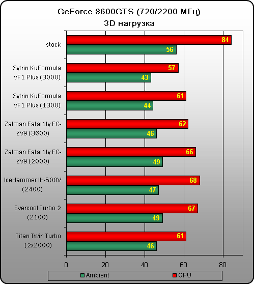 Методика тестирования: температурные показатели видеокарты снимаются в двух режимах: под 3D - нагрузкой и в простое. Нагрузка осуществлялась запуском теста на артефакты программы ATITool v.0.27, который создает максимальную равномерную нагрузку на графический процессор и позволяет «прогреть» его на уровне любой современной игры. Штатный кулер видеокарты Leadtek GeForce 8600GTS полностью соответствует референсному кулеру от компании NVIDIA. Его эффективности хватает для обеспечения должного уровня охлаждения, но от маленького вентилятора создается отчетливый шум, и любителям тишины он может показаться неприемлемым. Чтобы усложнить задачу кулерам, тактовые частоты видеокарты были немного увеличены с 675/2000 до 720/2200 МГц.