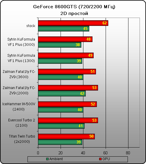 Очевидно, что по уровню производительности новинка от компании Titan действительно показала отличные результаты, пропустив вперед только такого «матерого» оппонента, как Sytrin KuFormula VF1 Plus, вновь доказавшего лидерство.Хотя если подойти к вопросу лидерства более объемно, то придется вспомнить, что Sytrin KuFormula VF1 Plus хотя и является самым эффективным воздушным кулером для видеокарт, побывавшим в нашей лаборатории, но он одновременно является и самым труднодоступным, поскольку на территории России не продается. А продукция компании Titan у нас распространена, значит, кулер Titan Twin Turbo с появлением на нашем рынке вполне способен занять место лидера воздушного охлаждения для видеокарт. Второй этап тестирования в простое, не изменил, а лишь подтвердил полученные ранее результаты: